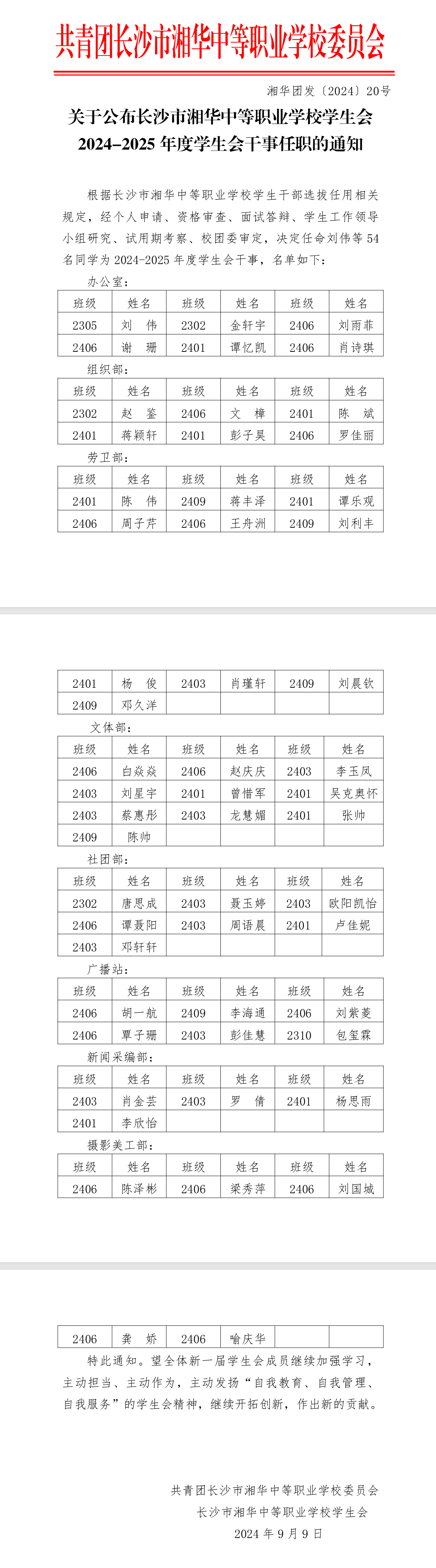 公布长沙市湘华中等职业学校学生会2024-2025年度学生会干事任职