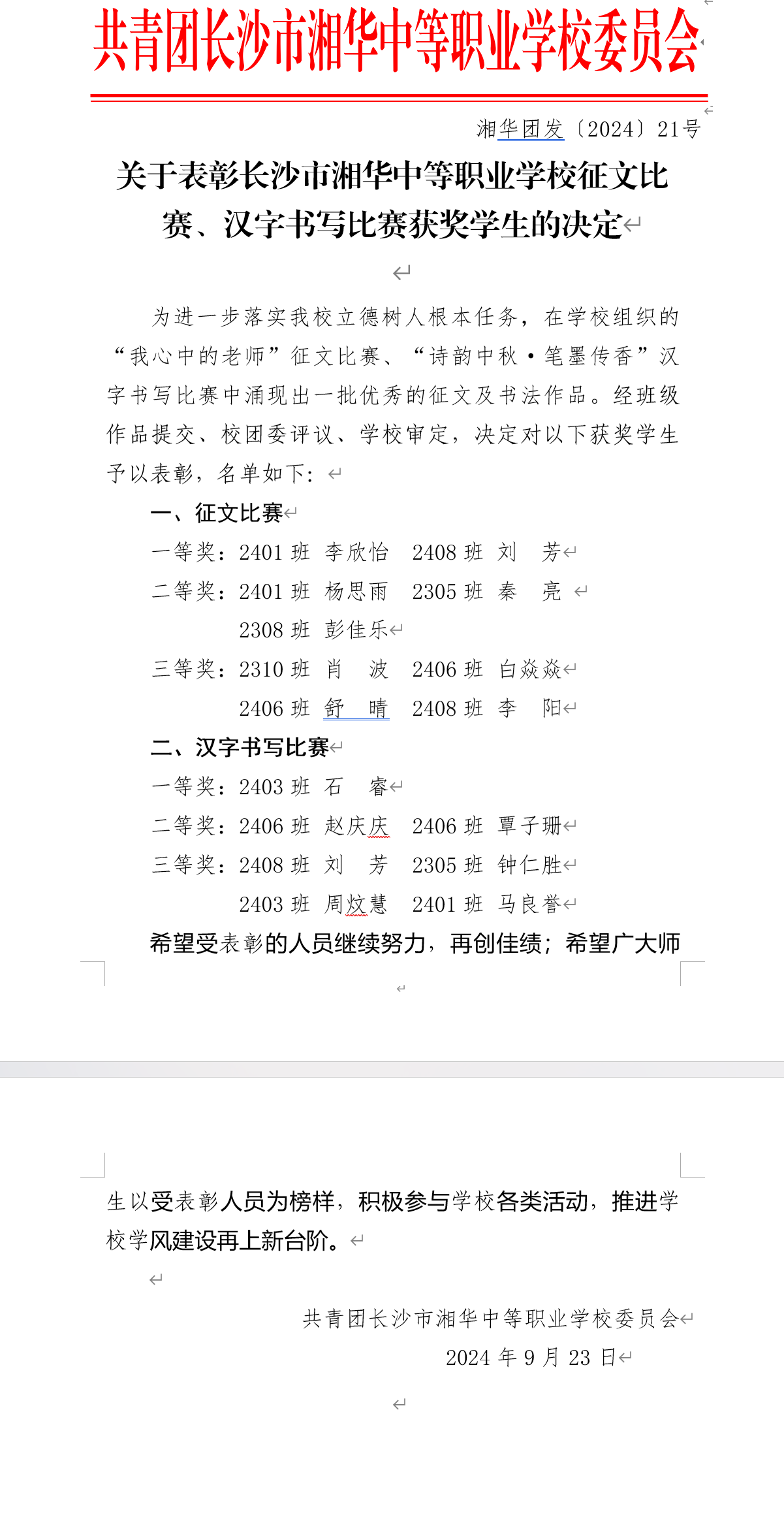 表彰长沙市湘华中等职业学校征文比赛、汉字书写比赛获奖学生