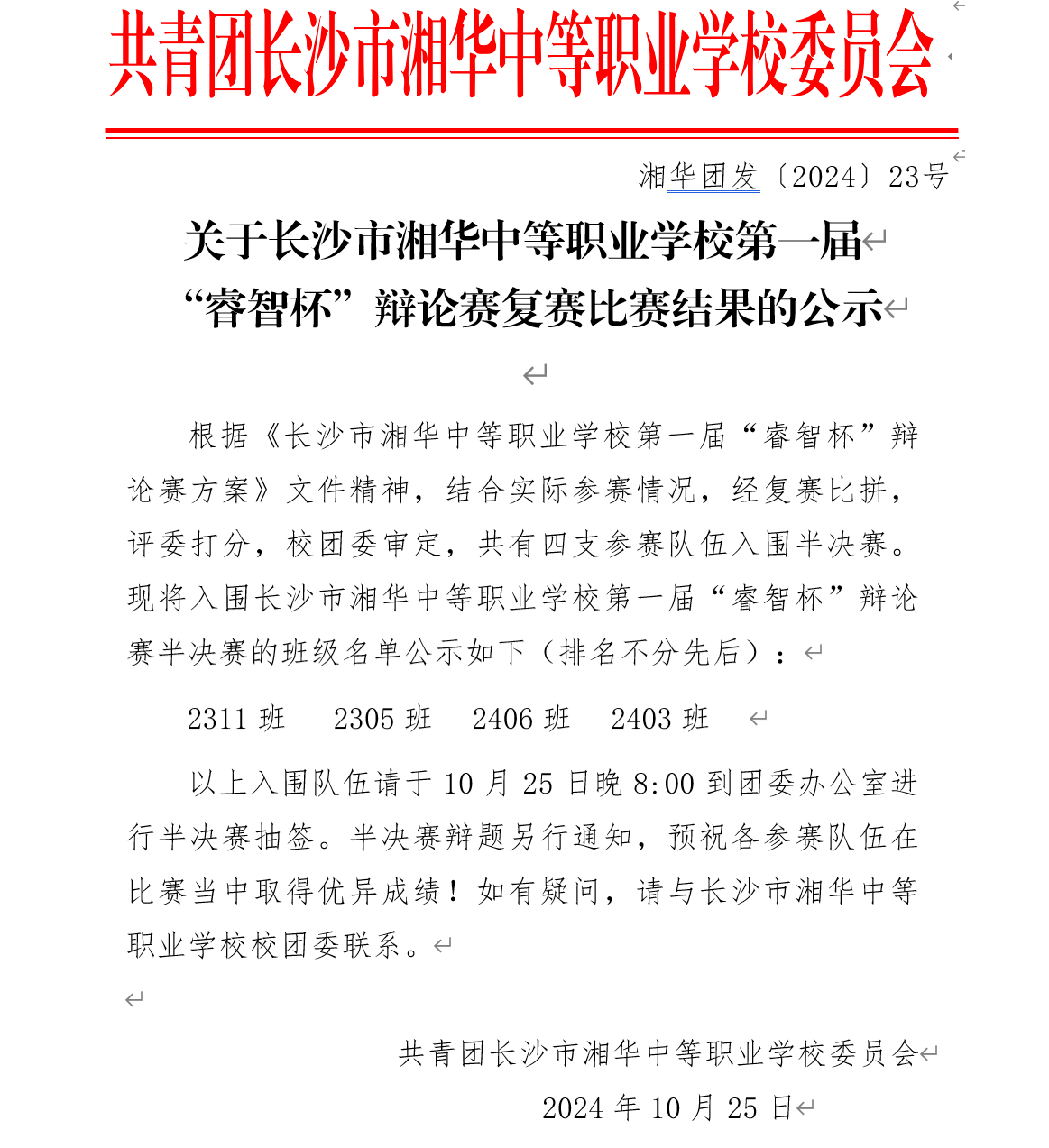 长沙市湘华中等职业学校第一届“睿智杯”辩论赛复赛比赛结果