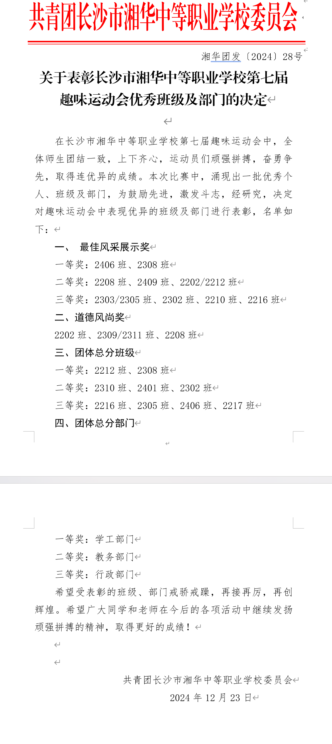 表彰长沙市湘华中等职业学校第七届趣味运动会优秀个人、班级及部门