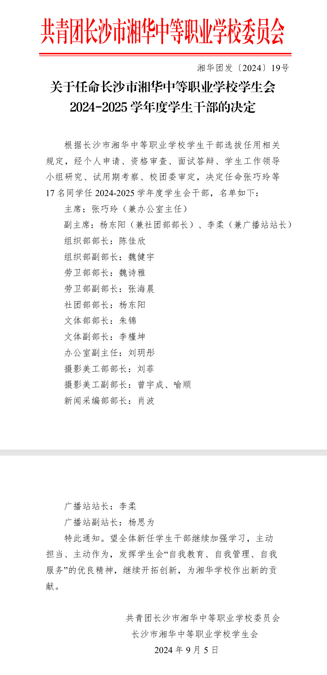 任命长沙市湘华中等职业学校学生会2024-2025学年度学生干部
