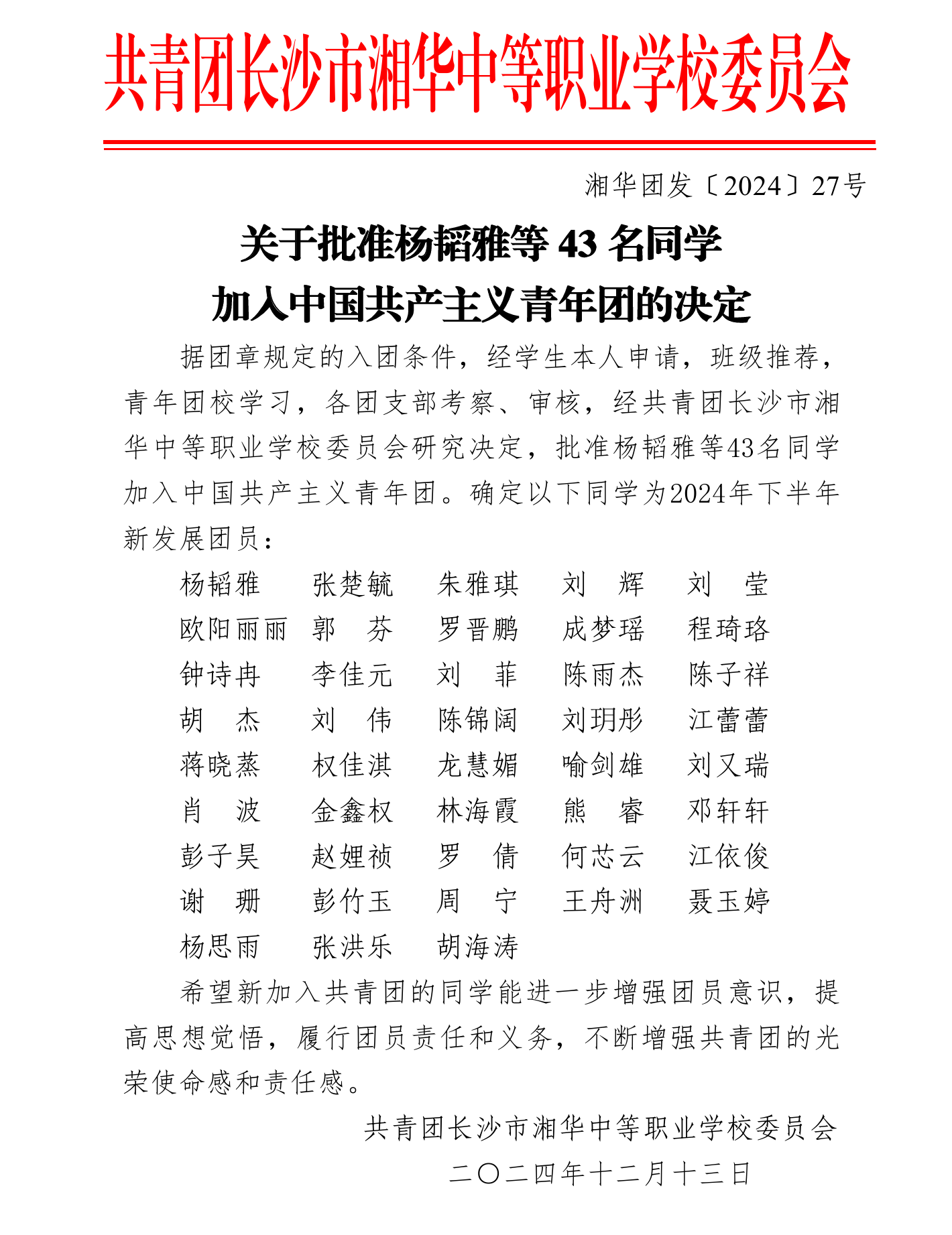 批准杨韬雅等43名同学加入中国共产主义青年团